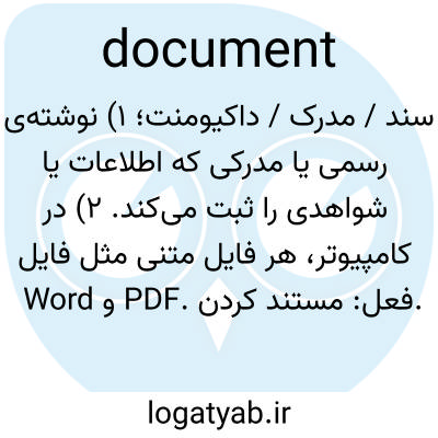 📌 کاغذ نوشته شده یا چاپ شدهای که اطلاعات یا مدرکی مانند گذرنامه، سند، رسید فروش یا بارنامه ارائه میدهد؛ یک سند قانونی یا رسمی.