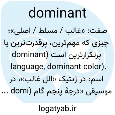 صفت: «غالب / مسلط / اصلی»؛ چیزی که مهم‌ترین، پرقدرت‌ترین یا پرتکرارترین است (dominant language, dominant color). اسم: در ژنتیک «الل غالب»، در موسیقی «درجهٔ پنجم گام (dominant)».