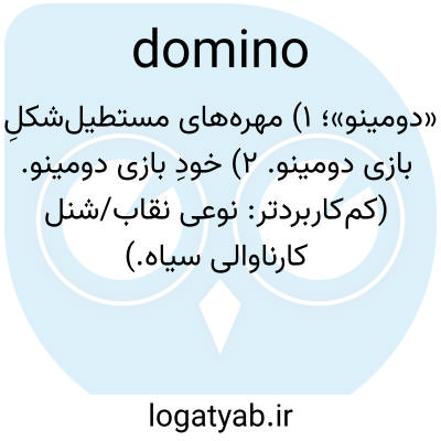 📌 (با فعل مفرد استفاده میشود)، دومینو، هر یک از بازیهای مختلفی که با چنین قطعاتی انجام میشود، معمولاً با تطبیق انتهای قطعات و چیدن دومینوها به صورت خطوط و الگوهای زاویهدار.