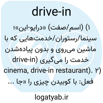 ۱) (اسم/صفت) «درایو-این»؛ سینما/رستوران/خدمت‌هایی که با ماشین می‌روی و بدون پیاده‌شدن خدمت را می‌گیری (drive-in cinema, drive-in restaurant). ۲) فعل: با کوبیدن چیزی را «جا کردن» (میخ را در چوب کوبیدن).