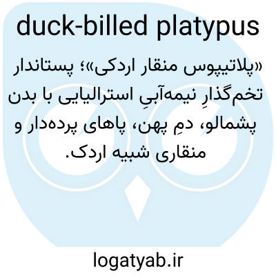 📌 گاهی اوقات به صورت خلاصه شده: نوک اردکی. پلاتیپوس. پستاندار تخم‌گذار دوزیست، Ornithorhynchus anatinus، از شرق استرالیا، با خز متراکم، منقار و دم پهن و پاهای پرده‌دار: خانواده Ornithorhynchidae. همچنین به تک‌سوراخیان مراجعه کنید.