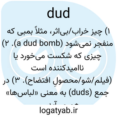 ۱) چیز خراب/بی‌اثر، مثلاً بمبی که منفجر نمی‌شود (a dud bomb). ۲) چیزی که شکست می‌خورد یا ناامیدکننده است (فیلم/شو/محصولِ افتضاح). ۳) در جمع (duds) به معنی «لباس‌ها» هم می‌آید، ولی این استفاده قدیمی‌تر است.