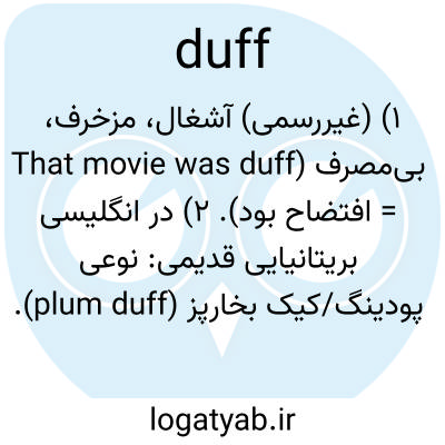 ۱) (غیررسمی) آشغال، مزخرف، بی‌مصرف (That movie was duff = افتضاح بود). ۲) در انگلیسی بریتانیایی قدیمی: نوعی پودینگ/کیک بخارپز (plum duff).