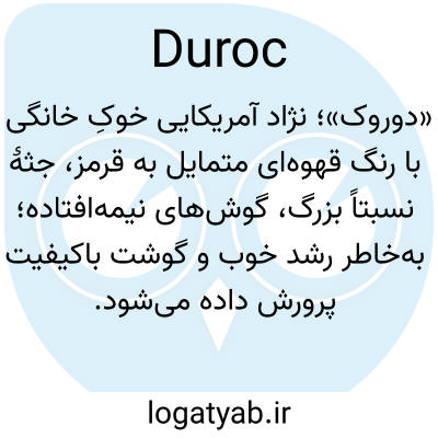 «دوروک»؛ نژاد آمریکایی خوکِ خانگی با رنگ قهوه‌ای متمایل به قرمز، جثهٔ نسبتاً بزرگ، گوش‌های نیمه‌افتاده؛ به‌خاطر رشد خوب و گوشت باکیفیت پرورش داده می‌شود.