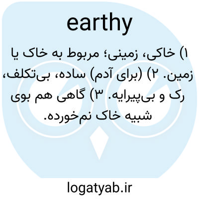 ۱) خاکی، زمینی؛ مربوط به خاک یا زمین. ۲) (برای آدم) ساده، بی‌تکلف، رک و بی‌پیرایه. ۳) گاهی هم بوی شبیه خاک نم‌خورده.