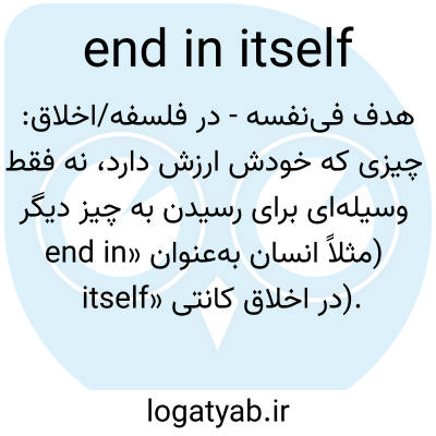 📌 هدف یا مقصدی که به خاطر خودش مطلوب است (و نه برای رسیدن به چیز دیگری). برای مثال، برای من، نوشتن کتاب به خودی خود یک هدف است؛ آنها واقعاً پول زیادی به دست نمیآورند. این عبارت از اسم end به معنای «علت یا هدف نهایی» استفاده میکند، کاربردی که به اوایل دهه ۱۵۰۰ برمیگردد.