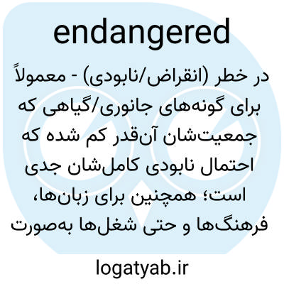 📌 زیستشناسی، بومشناسی، (گونهای از گیاهان یا جانوران در معرض خطر انقراض) با خطر انقراض بسیار بالا، که پس از وضعیت به شدت در معرض خطر انقراض، در رتبه دوم قرار دارد، طبق طبقهبندی فهرست قرمز IUCN: EN