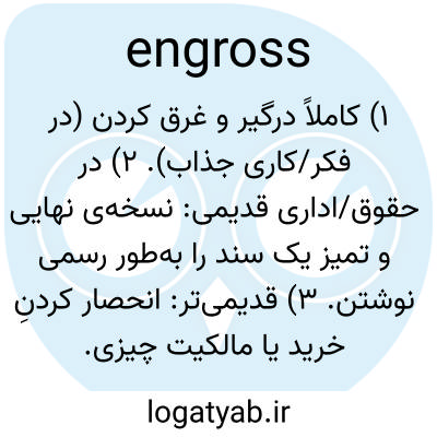 ۱) کاملاً درگیر و غرق کردن (در فکر/کاری جذاب). ۲) در حقوق/اداری قدیمی: نسخه‌ی نهایی و تمیز یک سند را به‌طور رسمی نوشتن. ۳) قدیمی‌تر: انحصار کردنِ خرید یا مالکیت چیزی.