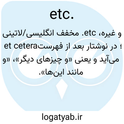 و غیره، etc. مخفف انگلیسی/لاتینی et cetera؛ در نوشتار بعد از فهرست می‌آید و یعنی «و چیزهای دیگر»، «و مانند این‌ها».