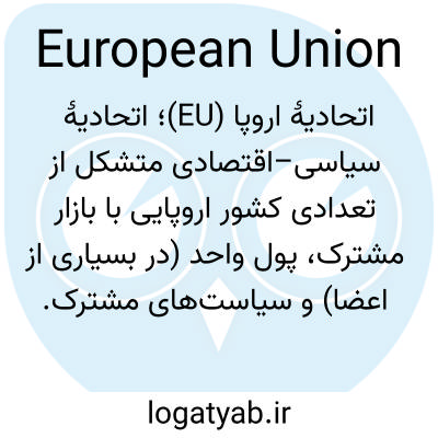 📌 اتحادیهای از کشورهای اروپایی که در سال ۱۹۹۳ با هدف دستیابی به یکپارچگی سیاسی و اقتصادی تشکیل شد. کشورهای عضو اتحادیه اروپا، شامل جامعه اروپا، عبارتند از اتریش، بلژیک، بلغارستان، کرواسی، قبرس، جمهوری چک، دانمارک، استونی، فنلاند، فرانسه، آلمان، یونان، مجارستان، ایرلند، ایتالیا، لتونی، لیتوانی، لوکزامبورگ، مالت، هلند، لهستان، پرتغال، رومانی، اسلواکی، اسلوونی، اسپانیا، سوئد و بریتانیا. در سال ۲۰۱۶، بریتانیا در یک همهپرسی به خروج از اتحادیه اروپا رأی داد.