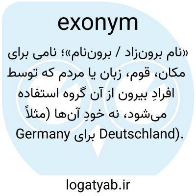 📌 نامی که توسط بیگانگان برای اشاره به یک گروه قومی، نژادی یا اجتماعی یا زبانی که خود آن گروه از آن استفاده نمی‌کند، به کار می‌رود، مانند چامورو به جای چامورو.