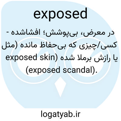 در معرض، بی‌پوشش؛ افشاشده - کسی/چیزی که بی‌حفاظ مانده (مثل exposed skin) یا رازش برملا شده (exposed scandal).