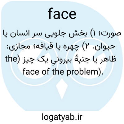 صورت؛ ۱) بخش جلویی سر انسان یا حیوان. ۲) چهره یا قیافه؛ مجازی: ظاهر یا جنبهٔ بیرونیِ یک چیز (the face of the problem).