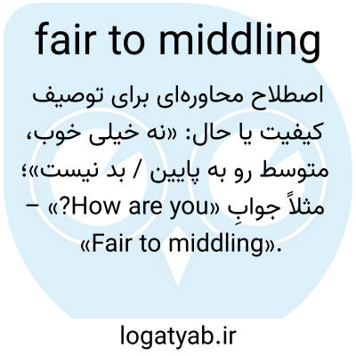 📌 متوسط، نسبتاً خوب، نسبتاً خوب، مثلاً از آنها پرسیدم که خانه جدیدشان را چطور دوست دارند و جان پاسخ داد: «نسبتاً متوسط». این عبارت که اغلب در پاسخ به سوالی در مورد سلامتی، کسب و کار یا موارد مشابه استفاده میشود، زائد است، زیرا fair و middling هر دو به معنای «نسبتاً خوب» هستند. [اواسط دهه ۱۸۰۰] همچنین ببینید: نمیتوان شکایت کرد.