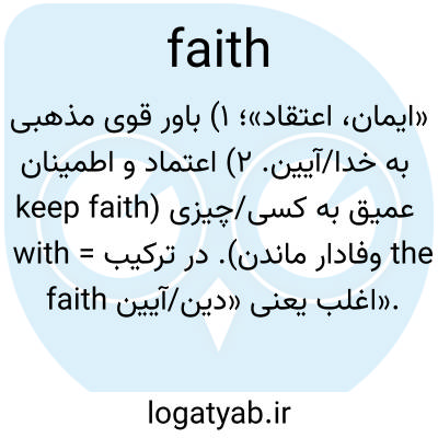 «ایمان، اعتقاد»؛ ۱) باور قوی مذهبی به خدا/آیین. ۲) اعتماد و اطمینان عمیق به کسی/چیزی (keep faith with = وفادار ماندن). در ترکیب the faith اغلب یعنی «دین/آیین».