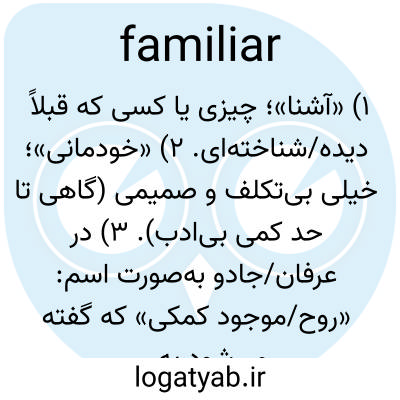 ۱) «آشنا»؛ چیزی یا کسی که قبلاً دیده/شناخته‌ای. ۲) «خودمانی»؛ خیلی بی‌تکلف و صمیمی (گاهی تا حد کمی بی‌ادب). ۳) در عرفان/جادو به‌صورت اسم: «روح/موجود کمکی» که گفته می‌شود به جادوگر خدمت می‌کند.