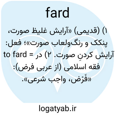 ۱) (قدیمی) «آرایش غلیظ صورت، پنکک و رنگ‌ولعاب صورت»؛ فعل: to fard = آرایش کردنِ صورت. ۲) در فقه اسلامی (از عربی فرض): «فَرْض، واجب شرعی».