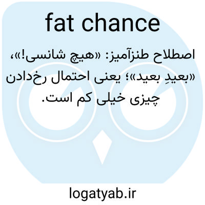📌 احتمال خیلی کم یا صفر، مانند «A fact chance he has to coming first»، یا «You think they will get married? Fat chance!» یک عبارت مرتبط، «fat lot» است، به معنی «very little or none at all» (خیلی کم یا اصلاً هیچ)، مانند «A fat lot of good it will do her». اولین مورد از این کاربردهای طعنهآمیز عامیانه به اوایل دهه 1900 و دومی به دهه 1890 برمیگردد.
