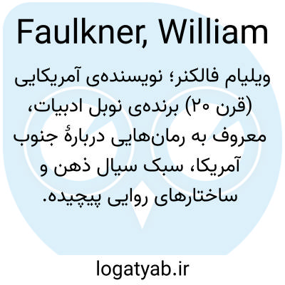 ویلیام فالکنر؛ نویسنده‌ی آمریکایی (قرن ۲۰) برنده‌ی نوبل ادبیات، معروف به رمان‌هایی دربارهٔ جنوب آمریکا، سبک سیال ذهن و ساختارهای روایی پیچیده.