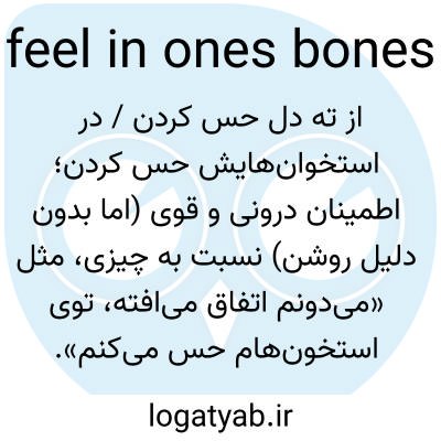📌 داشتن شهود یا حدس در مورد چیزی، مانند «مطمئنم که او موفق خواهد شد» - من می‌توانم آن را در استخوان‌هایم حس کنم. این عبارت به این تصور قدیمی اشاره دارد که افرادی که استخوان شکسته‌شان التیام یافته یا مبتلا به آرتروز هستند، قبل از باران، به دلیل کاهش فشار هوا، درد استخوان را تجربه می‌کنند و بنابراین می‌توانند تغییر آب و هوا را پیش‌بینی کنند. [حدود ۱۶۰۰]