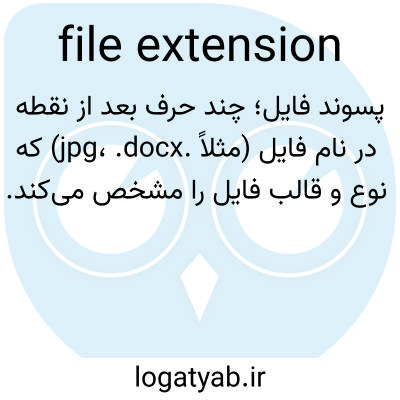 پسوند فایل؛ چند حرف بعد از نقطه در نام فایل (مثلاً .jpg، .docx) که نوع و قالب فایل را مشخص می‌کند.