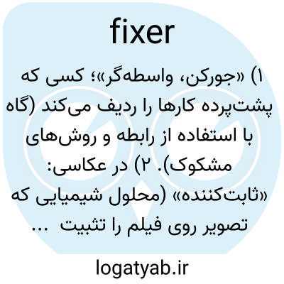 ۱) «جورکن، واسطه‌گر»؛ کسی که پشت‌پرده کارها را ردیف می‌کند (گاه با استفاده از رابطه و روش‌های مشکوک). ۲) در عکاسی: «ثابت‌کننده» (محلول شیمیایی که تصویر روی فیلم را تثبیت می‌کند).