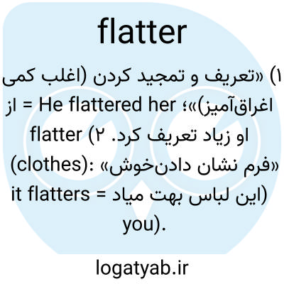 ۱) «تعریف و تمجید کردن (اغلب کمی اغراق‌آمیز)»؛ He flattered her = از او زیاد تعریف کرد. ۲) flatter (clothes): «خوش‌فرم نشان دادن» (این لباس بهت میاد = it flatters you).