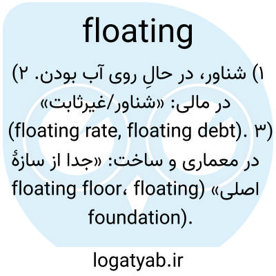 ۱) شناور، در حالِ روی آب بودن. ۲) در مالی: «شناور/غیرثابت» (floating rate, floating debt). ۳) در معماری و ساخت: «جدا از سازهٔ اصلی» (floating floor، floating foundation).