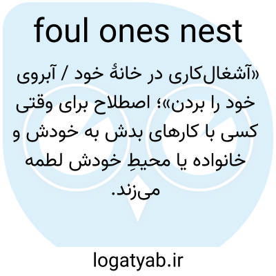 📌 همچنین، به لانه‌ی خود گند زدن. به منافع خود آسیب زدن، مانند جمله‌ی «با شکایت‌های مداومش از همسرش، فقط لانه‌ی خود را کثیف می‌کند». این عبارت استعاری، کثیف کردن لانه‌ی خود توسط پرنده را به رفتار انسان منتقل می‌کند. [اواسط دهه‌ی ۱۲۰۰ میلادی]