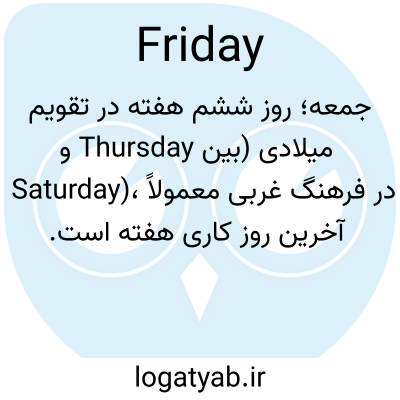 جمعه؛ روز ششم هفته در تقویم میلادی (بین Thursday و Saturday)، در فرهنگ غربی معمولاً آخرین روز کاری هفته است.