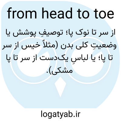 📌 همچنین،... روی تمام بدن، به طور کامل. برای مثال، او از سر تا پا سیاه پوشیده بود، یا او در تمام بدن، از نوک تا نوک پا، درد می‌کرد. این عبارات از دوران باستان قدمت دارند. واج‌آرایی از سر تا پاشنه پا حدود سال ۱۴۰۰ میلادی به وجود آمد، و شکسپیر در هملت (۱:۲) از «از سر تا پا» استفاده کرده است.