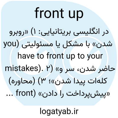 در انگلیسی بریتانیایی: ۱) «روبرو شدن» با مشکل یا مسئولیتی (you have to front up to your mistakes). ۲) «حاضر شدن، سر و کله‌ات پیدا شدن»؛ ۳) (محاوره) «پیش‌پرداخت را دادن» (front up the money).