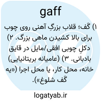 ۱) گَف؛ قلاب بزرگِ آهنی روی چوب برای بالا کشیدن ماهی بزرگ. ۲) دکلِ چوبی افقی/مایل در قایق بادبانی. ۳) (عامیانه بریتانیایی) خانه، محل کار، یا محل اجرا («یه گَف شلوغ»).