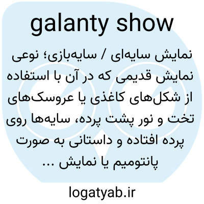 نمایش گالانتی، گال-آنتی شو، اسم. پانتومیم سایه‌ای که با انداختن سایه‌های آدمک‌های مینیاتوری روی دیوار یا پرده نمایش داده می‌شود.