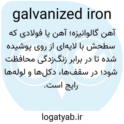 آهن گالوانیزه؛ آهن یا فولادی که سطحش با لایه‌ای از روی پوشیده شده تا در برابر زنگ‌زدگی محافظت شود؛ در سقف‌ها، دکل‌ها و لوله‌ها رایج است.