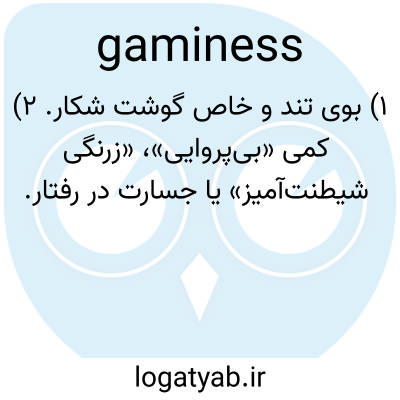 ۱) بوی تند و خاص گوشت شکار. ۲) کمی «بی‌پروایی»، «زرنگی شیطنت‌آمیز» یا جسارت در رفتار.