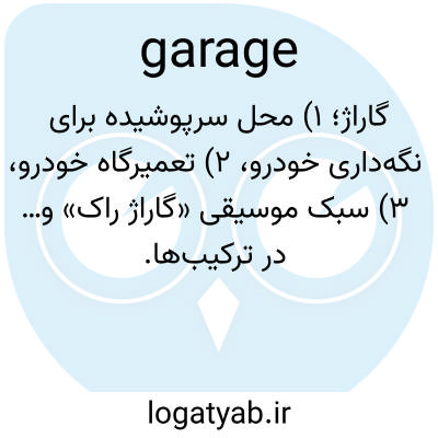 گاراژ؛ ۱) محل سرپوشیده برای نگه‌داری خودرو، ۲) تعمیرگاه خودرو، ۳) سبک موسیقی «گاراژ راک» و… در ترکیب‌ها.