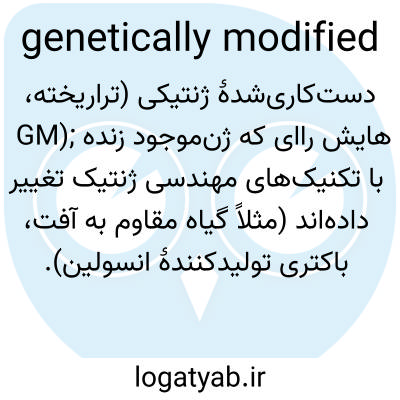 📌 GM. به معنی یا مشتق شده از ارگانیسمی که DNA آن به منظور بهبود یا اصلاح نقصها تغییر یافته است: غذای اصلاحشده ژنتیکی