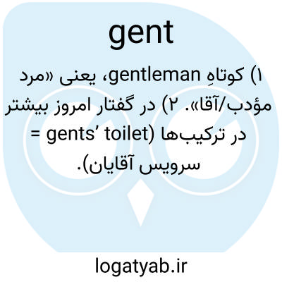 ۱) کوتاهِ gentleman، یعنی «مرد مؤدب/آقا». ۲) در گفتار امروز بیشتر در ترکیب‌ها (gents’ toilet = سرویس آقایان).