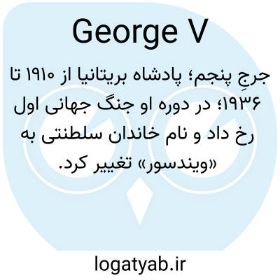جرجِ پنجم؛ پادشاه بریتانیا از ۱۹۱۰ تا ۱۹۳۶؛ در دوره او جنگ جهانی اول رخ داد و نام خاندان سلطنتی به «ویندسور» تغییر کرد.