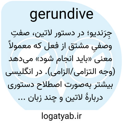 📌 (در لاتین) صفت فعلی شبیه به اسم مصدر که به الزام، ضرورت یا ارزش عملی که باید انجام شود اشاره می‌کند، مانند legendus در Liber legendus est به معنای «کتاب ارزش خواندن دارد».
