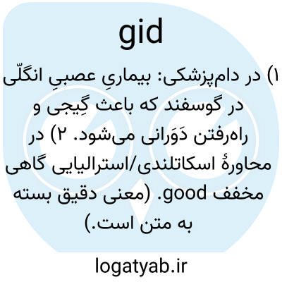 ۱) در دام‌پزشکی: بیماریِ عصبیِ انگلّی در گوسفند که باعث گِیجی و راه‌رفتن دَوَرانی می‌شود. ۲) در محاورهٔ اسکاتلندی/استرالیایی گاهی مخفف good. (معنی دقیق بسته به متن است.)