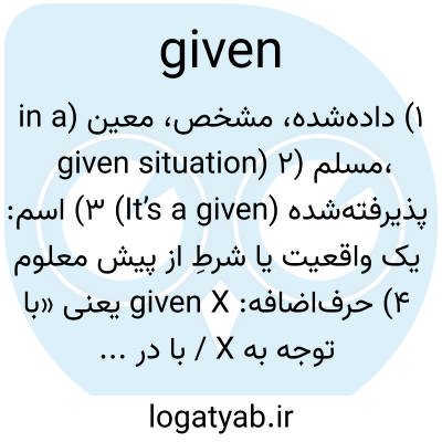 ۱) داده‌شده، مشخص، معین (in a given situation) ۲) مسلم، پذیرفته‌شده (It’s a given) ۳) اسم: یک واقعیت یا شرطِ از پیش معلوم ۴) حرف‌اضافه: given X یعنی «با توجه به X / با در نظر گرفتن X».