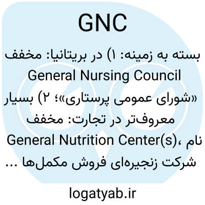 بسته به زمینه: ۱) در بریتانیا: مخفف General Nursing Council «شورای عمومی پرستاری»؛ ۲) بسیار معروف‌تر در تجارت: مخفف General Nutrition Center(s)، نام شرکت زنجیره‌ای فروش مکمل‌ها و محصولات تغذیه‌ای (برند GNC).