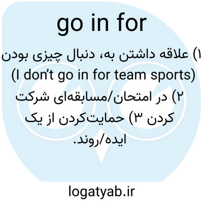 ۱) علاقه داشتن به، دنبال چیزی بودن (I don’t go in for team sports) ۲) در امتحان/مسابقه‌ای شرکت کردن ۳) حمایت‌کردن از یک ایده/روند.