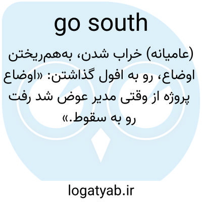 📌 رو به زوال یا افول، مانند عبارت «بازار سهام دوباره به سمت جنوب میرود». عموماً تصور میشود که این عبارت به قطبنما و نقشههای دوبعدی اشاره دارد که در آنها شمال بالا و جنوب پایین است. با این حال، در میان برخی از بومیان آمریکا، این اصطلاح حسن تعبیری برای مردن بود و احتمالاً همین معنا منجر به کاربرد فعلی آن شده است. [عامیانه؛ نیمه اول دهه 1900] همچنین به go west مراجعه کنید.