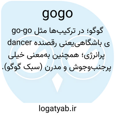 گوگو؛ در ترکیب‌ها مثل go-go dancer یعنی رقصنده‌ی باشگاهی پرانرژی؛ همچنین به‌معنی خیلی پرجنب‌وجوش و مدرن (سبک گوگو).