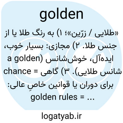 «طلایی / زرّین»؛ ۱) به رنگ طلا یا از جنس طلا. ۲) مجازی: بسیار خوب، ایده‌آل، خوش‌شانس (a golden chance = شانس طلایی). ۳) گاهی برای دوران یا قوانین خاصِ عالی: golden rules = قوانین طلایی.