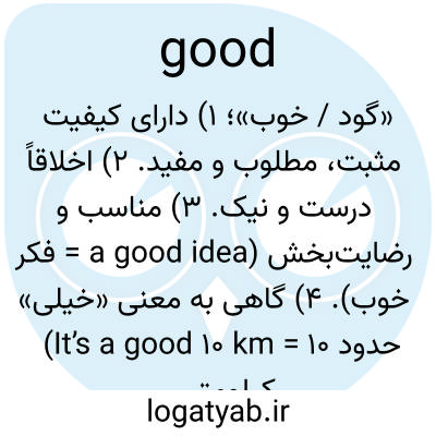 «گود / خوب»؛ ۱) دارای کیفیت مثبت، مطلوب و مفید. ۲) اخلاقاً درست و نیک. ۳) مناسب و رضایت‌بخش (a good idea = فکر خوب). ۴) گاهی به معنی «خیلی» (It’s a good 10 km = حدود ۱۰ کیلومترِ کامل).