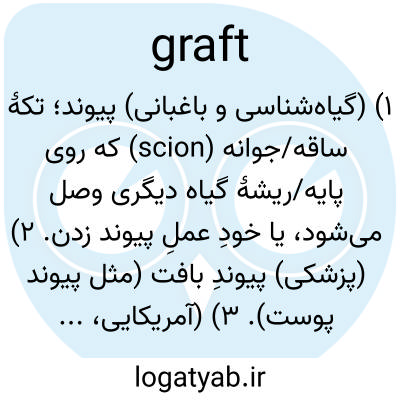 ۱) (گیاه‌شناسی و باغبانی) پیوند؛ تکهٔ ساقه/جوانه (scion) که روی پایه/ریشهٔ گیاه دیگری وصل می‌شود، یا خودِ عملِ پیوند زدن. ۲) (پزشکی) پیوندِ بافت (مثل پیوند پوست). ۳) (آمریکایی، غیررسمی) رشوه‌خواری و سوءاستفادهٔ مالی/سیاسی. ۴) (اسلنگ بریتانیایی) زحمتِ زیاد، کارِ سخت؛ to graft یعنی «سخت کار کردن».